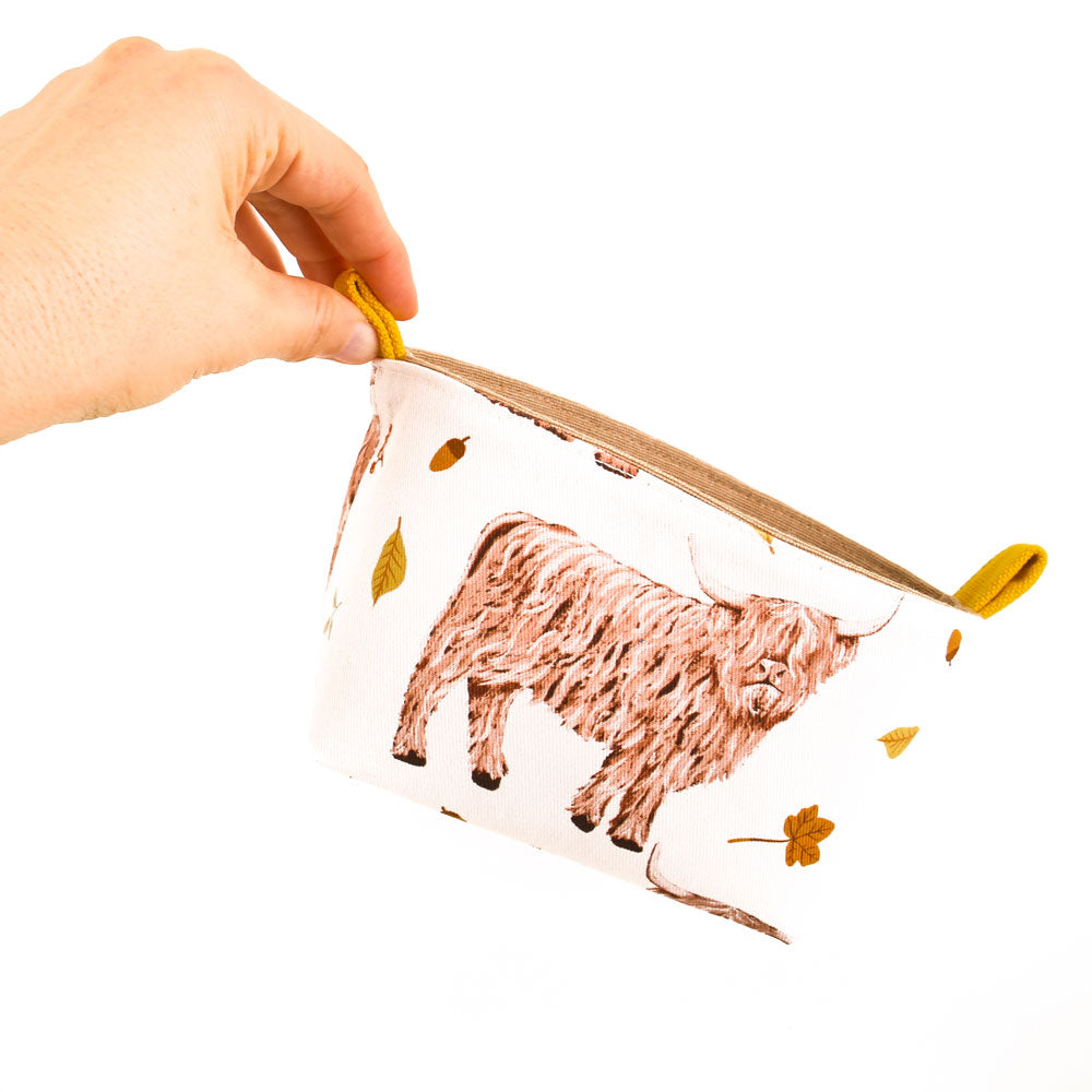- Featuring Highland Cow fabric pattern, beige lining and mustard yellow tabs